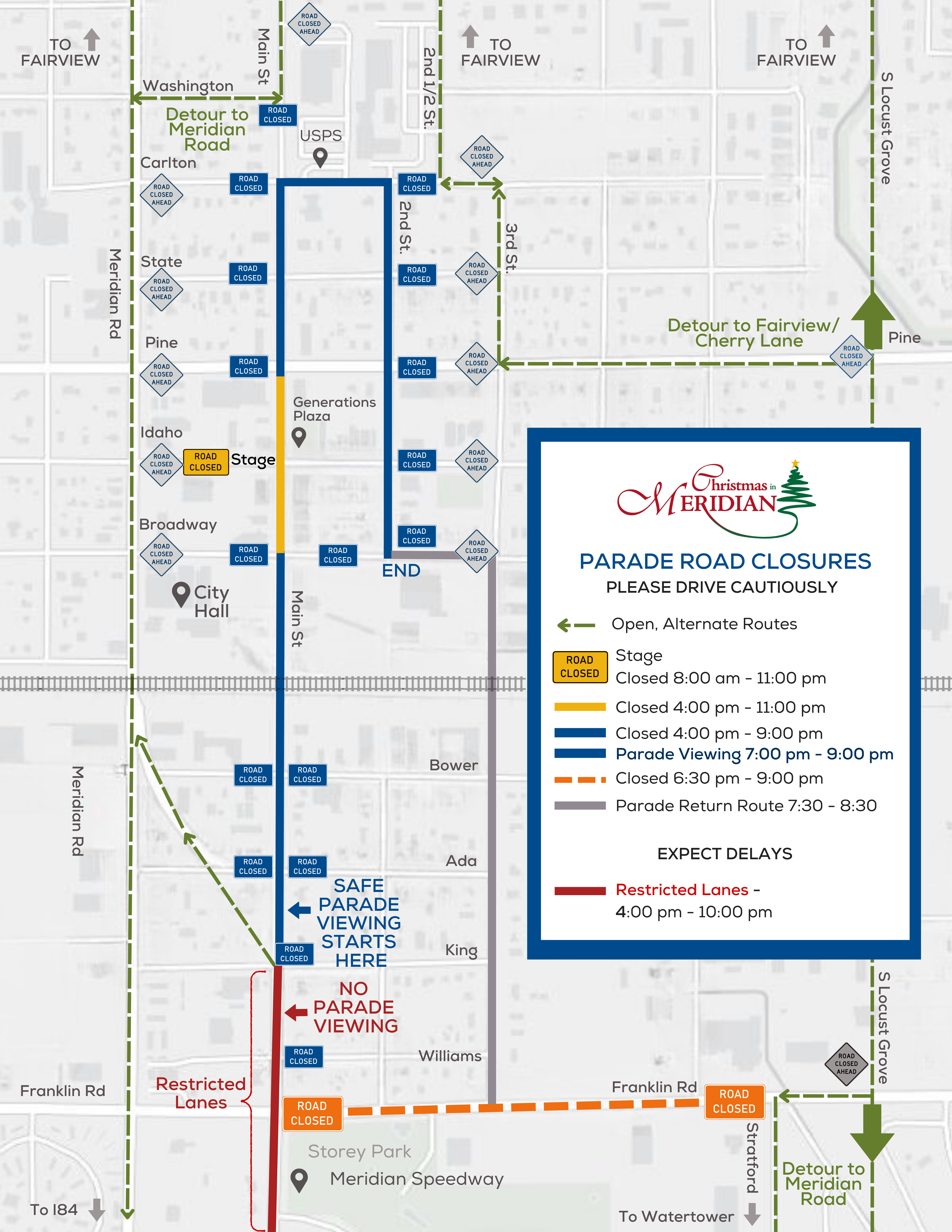 3rd Street will be closed from E. Broadway Avenue to E. Franklin Road from 7:00 – 9:00 pm for the return route back to the Meridian Speedway.